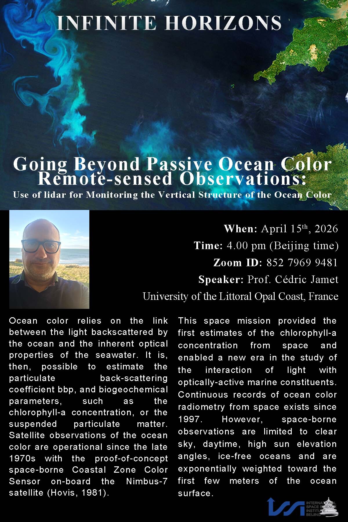 We have the pleasure to host the next Infinite Horizons' seminar on April 15th, 2026. Our host will be Prof. Cédric Jamet from the University of the Littoral Opal Coast will talk about Going Beyond Passive Ocean Color Remote-sensed Observations: Use of lidar for Monitoring the Vertical Structure of the Ocean Color.