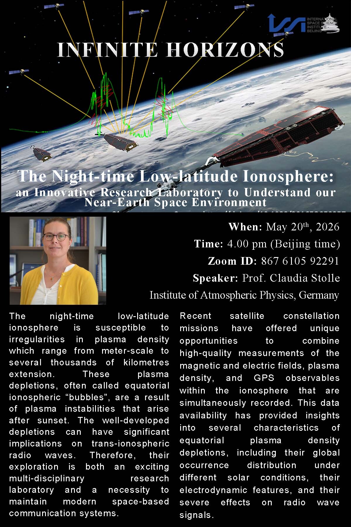 We have the pleasure to host the next Infinite Horizons' seminar on May 20th, 2026. Our host will be Prof. Claudia Stolle from the Institute of Atmospheric Physics will talk about The Night-time Low-latitude Ionosphere: an Innovative Research Laboratory to Understand our Near-Earth Space Environment.