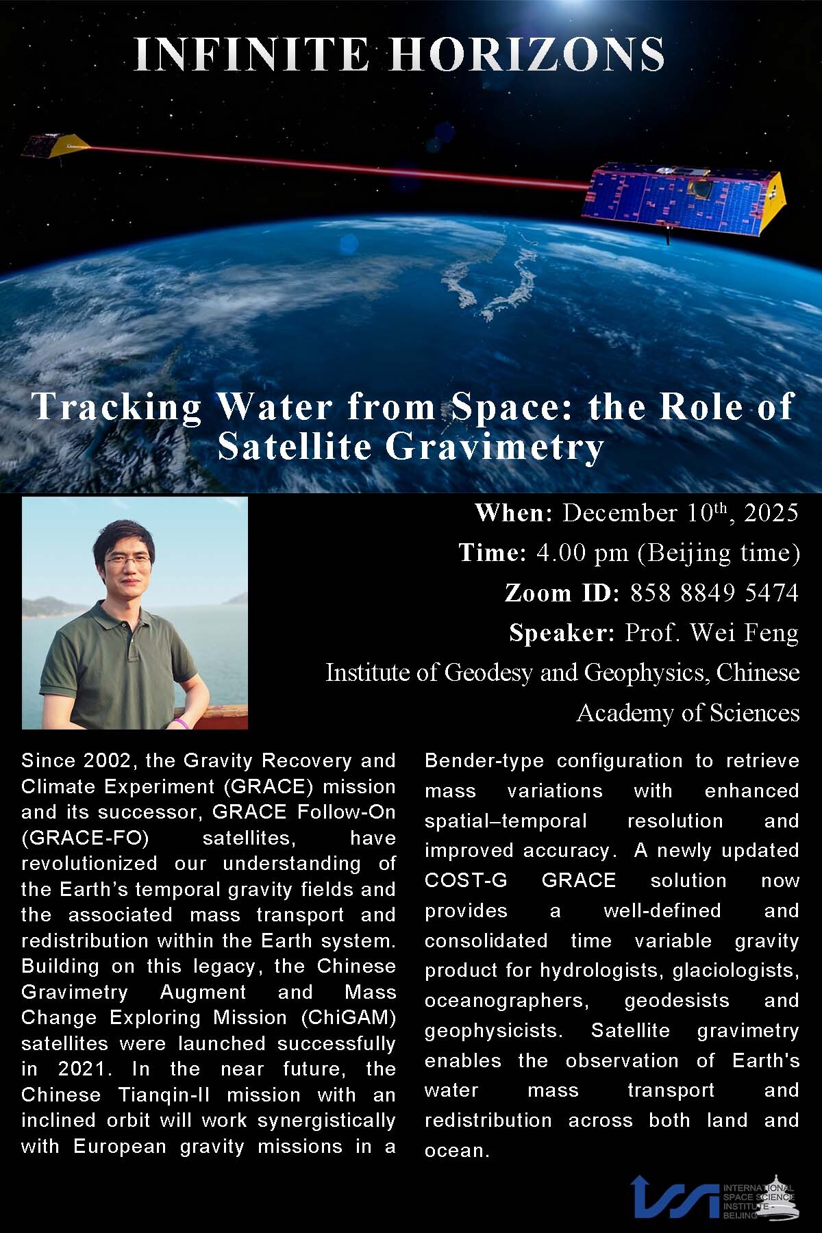 We have the pleasure to host the next Infinite Horizons'seminar on December 10th,2025. Our host will be Prof. Wei Feng from the School of Geospatial Engineering and Science,Sun Yat-sen University will talk about Tracking Water from Space: the Role of Satellite Gravimetry.