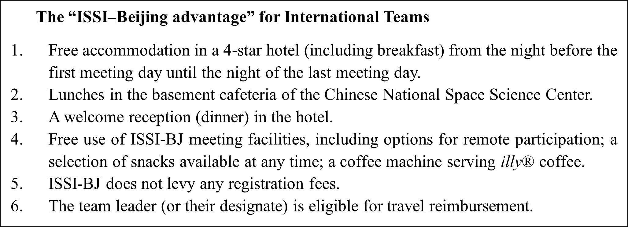 International Teams are usually composed of 8–12 scientists from different institutes and nationalities, covering a wide range of expertise; a minimum of four nationalities is required. They hold two (or, exceptionally, three) one-week in-person meetings over a period of 12 to 18 months. International Teams work collaboratively on the analysis and interpretation of space-based data (ground-based data or theoretical modelling outputs may be included if they contribute meaningfully to the project’s scientific remit), with the eventual aim of publishing peer-reviewed journal articles. See also http://www.issibj.ac.cn/program/it/.