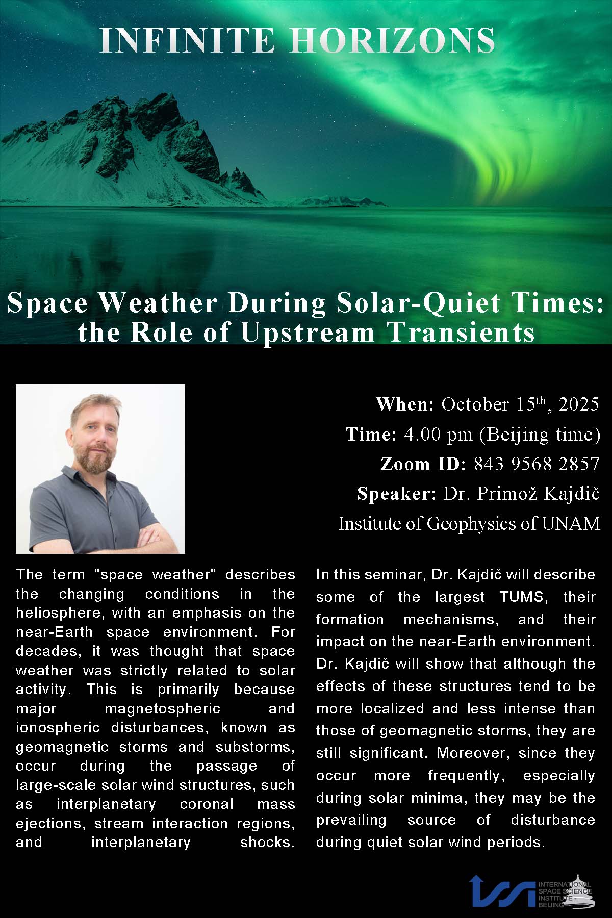 We have the pleasure to host the next Infinite Horizons' seminar on October 15th, 2025. Our host will be Dr. Primož Kajdič from the Institute of Geophysics of UNAM will talk about Space Weather During Solar-Quiet Times: the Role of Upstream Transients.